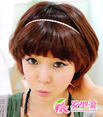 蓬松齐刘海+bobo头 此款波波头发型是最新发型哦!不像传统的bob头那样注重弧度感,而是采用层次感的修剪,洋溢着青春个性,蓬松齐刘海增添了女人味,利用水钻细发箍营造出几分柔情,很迷人。