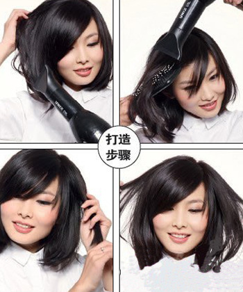 2.用板梳蓬松、拉直超管用喷上一层造型喷雾,再用大板梳沿着发丝的方向拉开、吹直。因为大板梳有其他工具或手无法代替的拉顺发丝、吹直和拉蓬发根等作用,加上这一步,便可让头发在一点蓬松凌乱中还留有BOB头的顺直。
