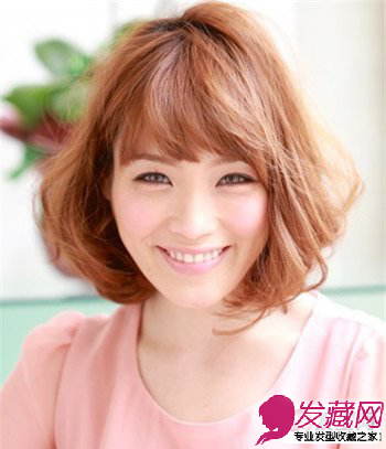 碎剪的齐刘海修饰了过宽的额头,两侧采用不对称的烫卷方式,显得非常活泼生动,灿烂的笑容加上棕黄色的染发,更显热情洋溢。