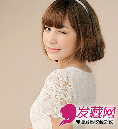 充满韩式文静气息的齐刘海短发发型,中短长度干练中不失女人味,齐整的刘海遮住额头,发箍装点,一身蕾丝裙,完美公主变形记。