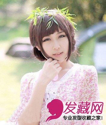 齐刘海加上两鬓的发线具有修颜的效果,特别适合大脸妹妹,自然的盘发棕色的染发加上叶子编的头圈,在秋日阳光的照耀下十分唯美。