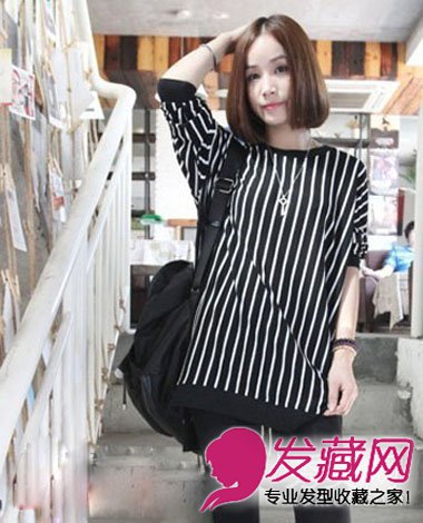 这款是中分波波头,整体看上去很柔顺,只在底部微微隆起一点点弧度,中分的刘海显得脸很小,搭配条纹T恤,女人味十足。