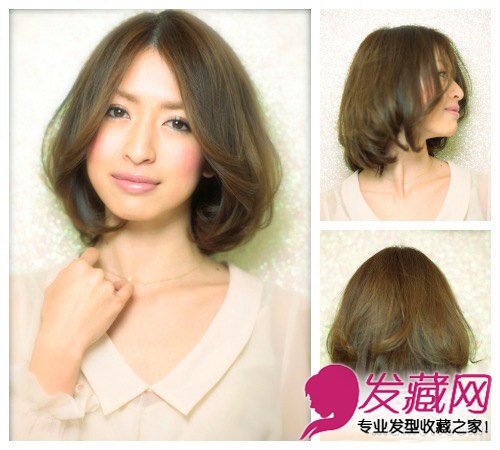 中分发型两边刘海轻松瘦脸,中短发微烫设计增添质感。