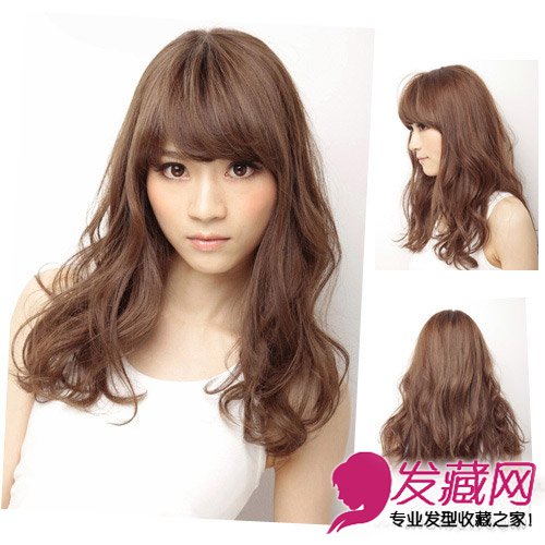 微斜的刘海搭配蓬松的长卷发遮盖额头,让鹅蛋脸瞬间变小脸。巧克力色染发提升时尚感。