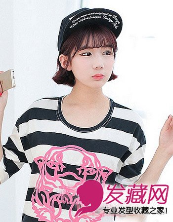这款空气大感刘海式的女生波波头发型最显小女生的娇小可爱感了,只是简单将中短发式的波波头别于耳后,再与韩式时尚空气感刘海相搭,清新低调的当要与黑色的帽子造型也是很显小女生的青春活力感的。