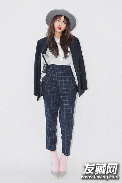 韩式的中分刘海发型,中分的空气刘海搭配圆帽街头感十足,格子图案的高腰裤彰显不一样的帅气感觉。