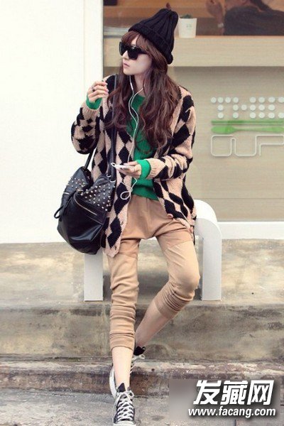 时尚的长卷发发型,棕色的染发颜色很衬肤色,哈伦裤加球鞋的搭配休闲感十足,外出旅游什么的时候最适合了。