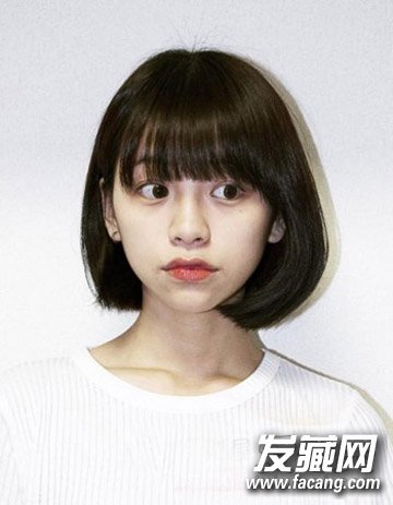 再是一款很显小女生的可爱清纯风式的最新女生波波头发型设计,利用提清新自然的乌黑发色,而配合这种简单而厚重的发梢造型与清新的齐刘海修颜更显清纯可爱感。