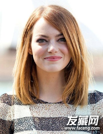 圆脸的女孩参考Emma Stone的长波波头,到锁骨的长度和顺直的线条,有拉长脸型,显脸瘦的效果。