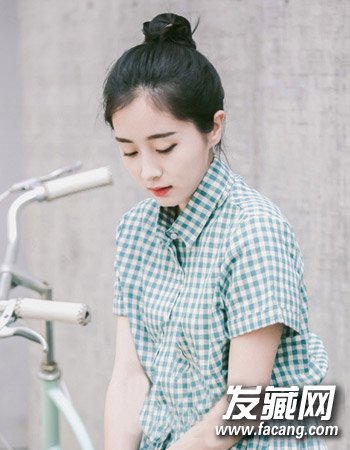 清新绿色的短袖衫与可爱的丸子头搭配起来也颇显清新感哦,清爽的露额发型与造型的设计打造出个性与时尚的一面来。