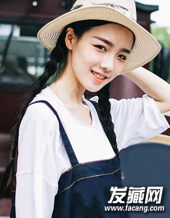 可爱的双麻花辫发型,清爽的露额发型与帽子搭配起来显露出无比的甜美与文艺范来,整个造型适合女生。
