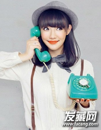 十分可爱的一款文艺女生的发型,甜美的内扣中长发发型,可爱的齐平刘海与柔顺的发丝搭配起来还有帽子的造型显得颇为时尚。