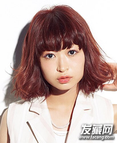 酒红色的波波头配上齐肩的短发十分时尚大气,及眉的齐刘海做内扣处理,搭配蓬松飘逸的短卷发,轻松修出一张精致小脸,也让整个发型看上去更加的饱满,非常适合发量少的美眉。