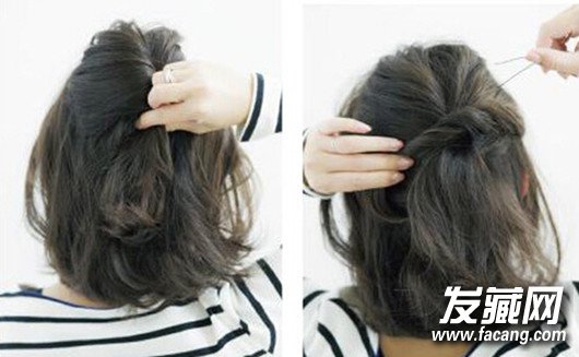 步骤一:如图所示,从头顶处取出一部分头发,向右扭转,并用发夹固定在后脑勺中心;