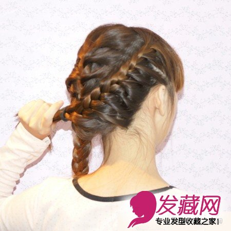 第四步再接着将另一半头发也编一个从右向左侧斜的蜈蚣辫,注意要侧斜过来哦!跟左边一样的编发。