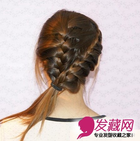 第六步我们再将两股辫子融合到一起。用黑色橡皮筋绑好。注意拆皮筋的时候要小心哦不能让头发散掉咯。