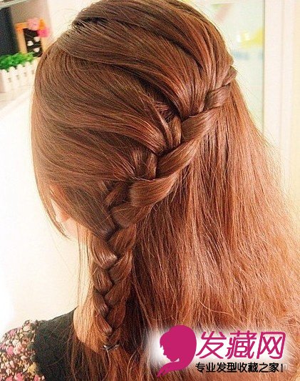 步骤三编至耳朵位置,下面的编基础三股辫至发尾,扎好。