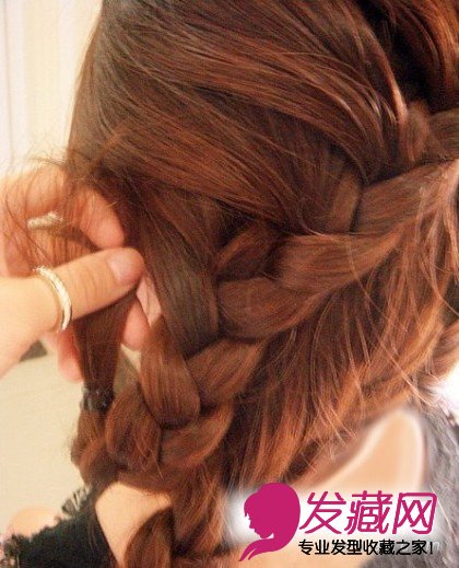 步骤六现在我们把第一条辫子的发尾部开始往头发里塞进去,角度还是侧着的哦!用小夹子固定。