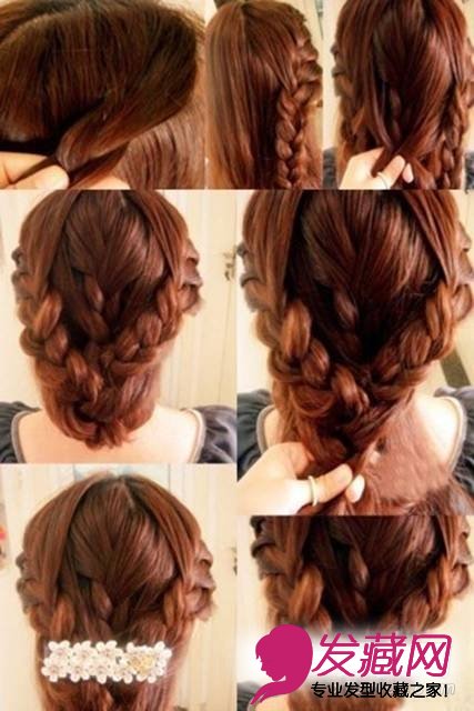 如图所示,就是分成三组编好之后再编成大辫子,随后再盘起来,把发端藏在厚厚的头发里。其实我觉得即使不盘起来也挺好看的,盘起来更担心会掉下来。不过记住事先要喷上服帖的摩丝喷雾哦。