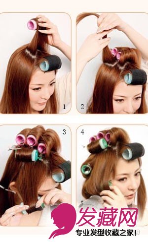 1、在九成干的头发基础上做卷。刘海部分用大号的空卷向前做平卷,如果刘海太短可以用魔发贴做固定,这样刘海的弧度会更加完整。