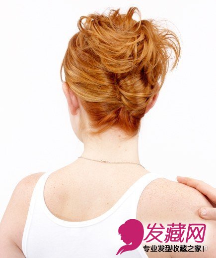 用你不是常用的那只手将头发拂到一边,稍稍偏离中心。用另一只手从下至上垂直插入U型发夹。