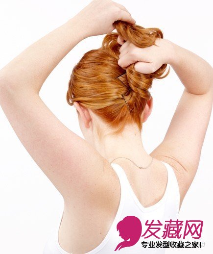 在头发扭转的最后,水平插入发夹,并与垂直插入的发夹交叉以稳住发型。