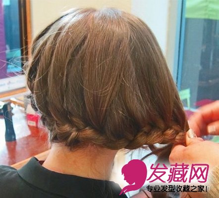 先将头发侧分,然后开始从发量较少的一边编法式麻花辫,一直编到耳朵上方为止。编发时依照头部的弧度适时改变辫子的形状。