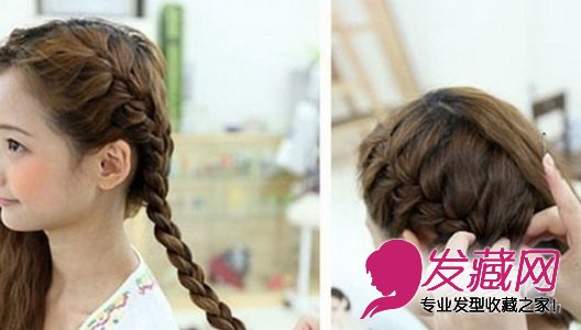 4、捏起发辫把发尾送入头发内部,倒放发髻,取出发夹固定。另一边的头发同样如此操作,做出编发发髻。