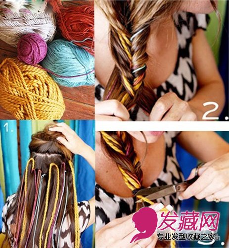 1.把头发做一个分区,将最外层的头发盘起。然后根据自己头发的长短对毛线进行裁剪(裁剪长度是头发的2倍多)。取小缕头发用毛线(最好靠近发根)去捆绑,不同颜色、不同粗度的毛线都可以均匀多捆绑一些就ok了。