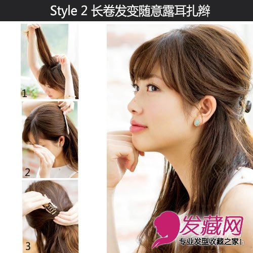 妩媚长卷发女生也可清爽起来哦。在脑后随意以发夹束起发辫,露出小巧白皙的双耳,点缀一副水果糖颜色的小耳环,偶尔找一天走走小清新路线也不错。