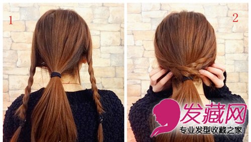 1、将耳朵两边留出一小戳头发,编成麻花,而中间的头发则扎成马尾。