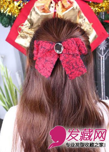 把头发梳理一遍,将头顶上方的头发扎成一个松松的马尾,在马尾的上方别一个可爱的蝴蝶结发饰