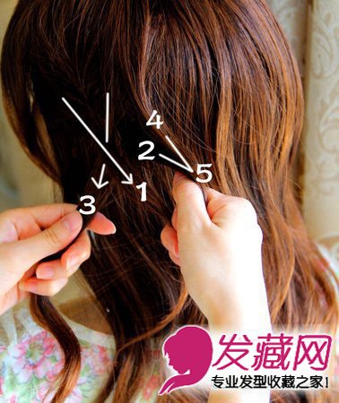 5:在2股旁边取一片发片(发量不要取的太多),标记为4股,把2和4股合二为一,称为5股
