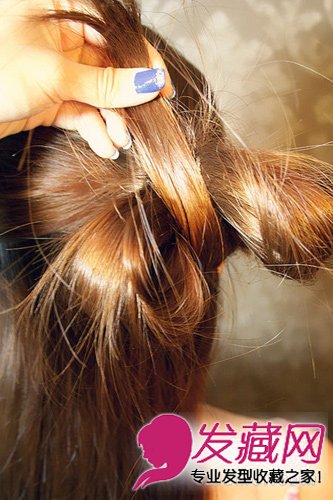 将取出的头发,斜斜的用皮筋扎一个揪,不要将发尾抽出,呈现一个扇形