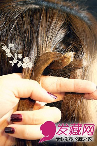把打的结,稍微拉紧一点。紧着再在左边取一束头发,与刚才左边的那一束合拢