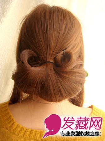 捏住固定好的马尾向里弯曲,用黑夹子固定在原先扎好的马尾皮筋处的下方
