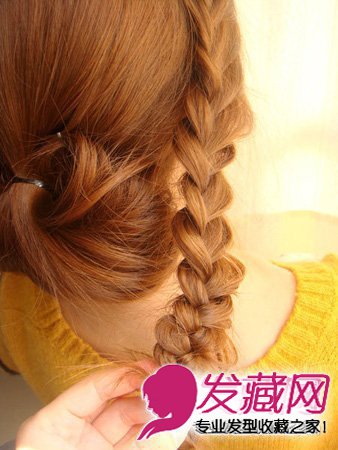 编到耳际左右又换成麻花辫的编法,一直编至发尾处,将编好的辫子抽送