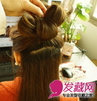 步骤3:将拉出来的马尾辫子往上再往皮筋处弄个孔拉出来。