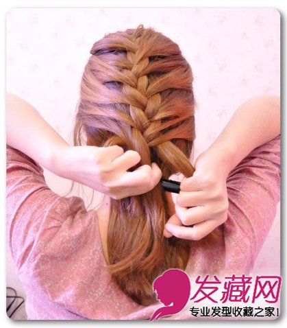 2 将上层的秀发沿着蝎子辫的样式将秀发编起来