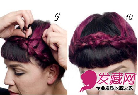 Step9:同理,右侧的编发往上绕转,发尾与左辫相交在左上方,并用发夹穿过它以固定。