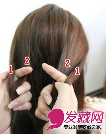 步骤一:将头发分成上下两个区域,从上区域的两边分别取出两束头发放到手上,再把两边的两书头发分成1、2两个等分。