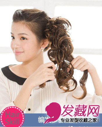 step1:先将卷发扎成侧边马尾,再编成三股辫。