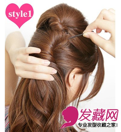step 2:在上部的发束中加入头发集中在侧边然后扭转。用发夹固定。