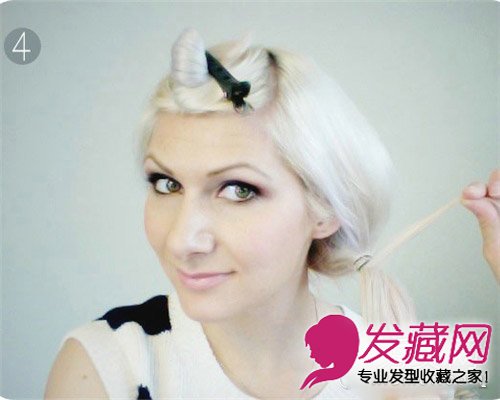 STEP 4 在扎好的马尾中抽取一小撮头发卷成发束后开始缠绕橡皮筋处,直到缠绕完毕,最后把剩余的塞进缠绕的头发中。这部分需要选取整齐而且比较长的一小撮发束而不能选取散乱参差不齐的。