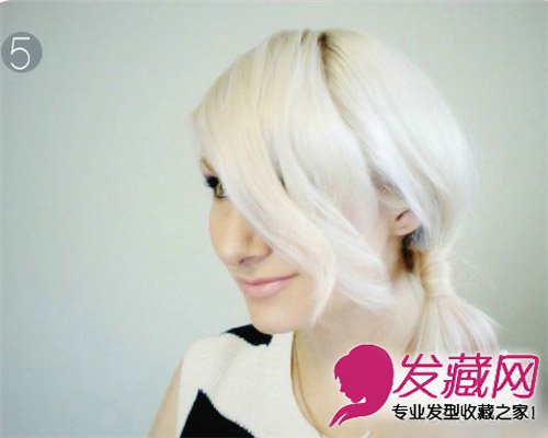 STEP 5 在上一步骤后将会出现如图所示的简单马尾,这个时候把刘海处的大架子拿掉,大片的刘海掉落下来形成随性的侧分刘海。