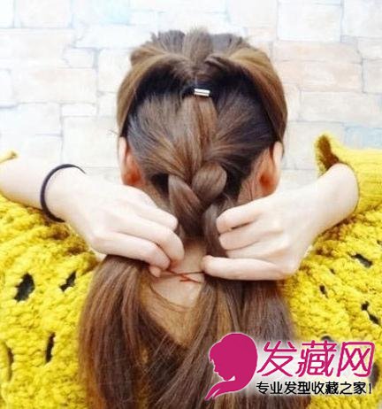 这时候可以开始编发了,从这一步开始,可以多变了,将束好的马尾和剩下的头发混合在一起编麻花,会鱼骨辫妹子,这样编也很好看。