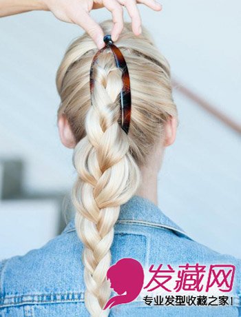 step4:法式麻花辫需要一边编织一边加入新的发束,待所有的头发都编进辫子中后,采用麻花辫的编织手法一直编制到发尾,并用皮筋扎好。接下来将准备好的竖夹夹在辫子根部。