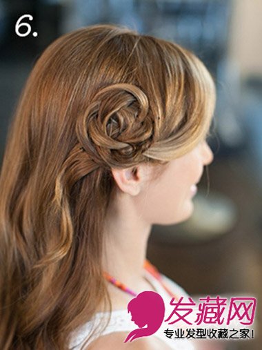 Step6:保留部分的头发可以不旋转进花辫中,自然地垂落也很美观。