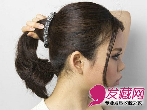 setp2:用闪亮闪亮的发饰品做装饰,夹牢前还是要用手抓住头发一会再放手。