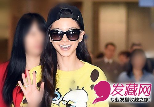 反带着帽子的baby非常帅气,头发并没有往常一样的大卷,而是采用了波浪卷,增加长发的流线度。一边挽到背后显得非常优雅,黑色的墨镜霸气十足。